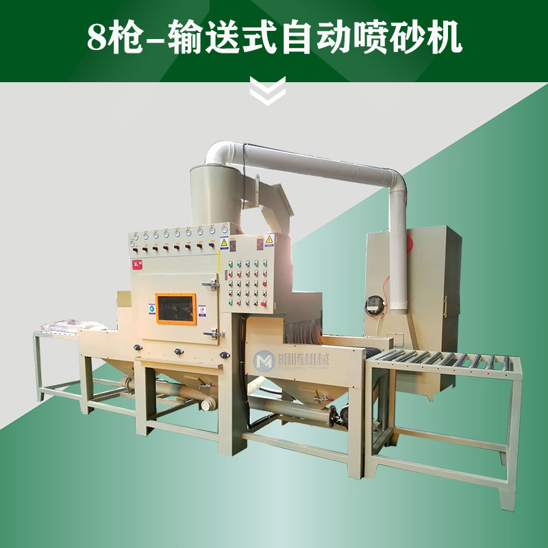 3、加工好的工件随即进入吹净舱,吹净枪将残留在工件上的砂尘吸净,再从传动装置另一端输出。