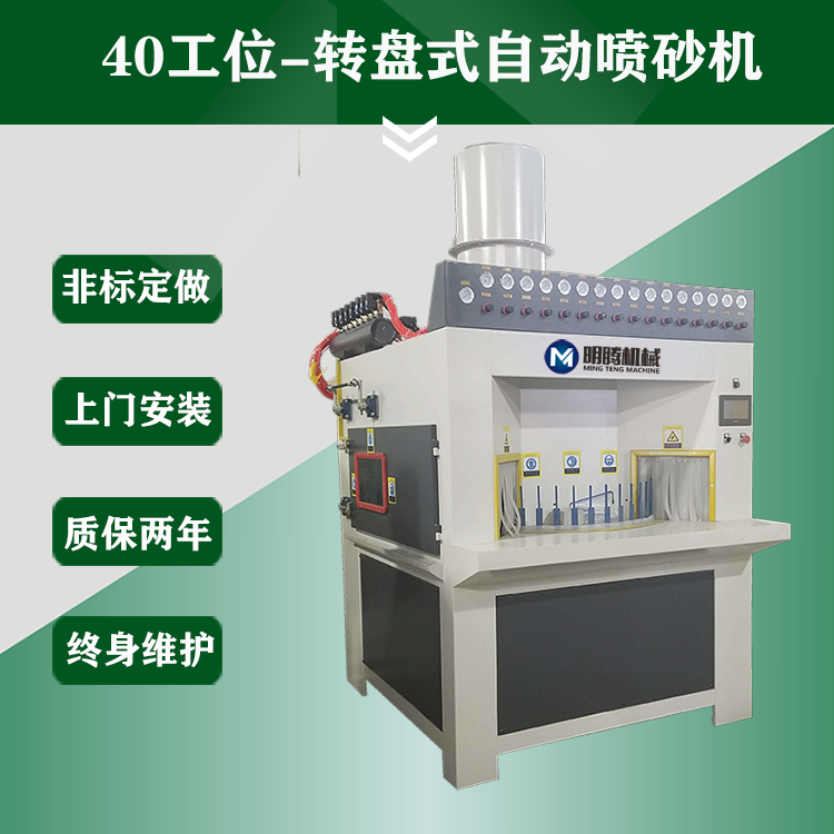 本机根据客户提供的产品特征,专门设计的40工位连续式转盘自动喷砂机,用于回转件的表面处理,可清除工件表面的结合纹、流纹及模痕等;满足对工件表面进行去毛刺、氧化皮、表面光饰、电镀或喷涂前预处理等工艺要求。