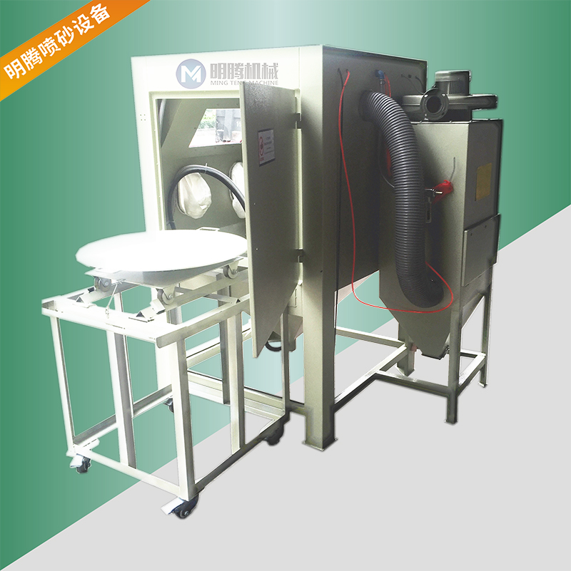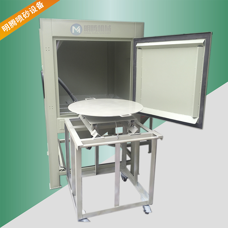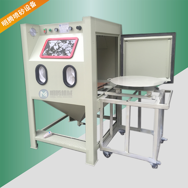 2、加装活动台车和转盘,操作时仅需将工件放在台车转盘上,然后将推入机内即可从事喷砂作业,十分简单省力, 推车可在车间推动行走。载重:250公斤。