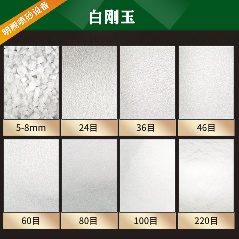 各种高端产品,工艺或五金等产品表面美化处理,喷砂后表面洁白无杂质,免去清洗烦恼。细号白刚玉可作抛光研磨之选。铁质工件去锈、除污、除氧化皮,增大镀层、涂层附着力,铝质工件去氧化皮,表面强化、光饰作用,铜质工件去氧化皮亚光效果、玻璃制品水晶磨砂、刻图案,塑胶制品亚光效果。