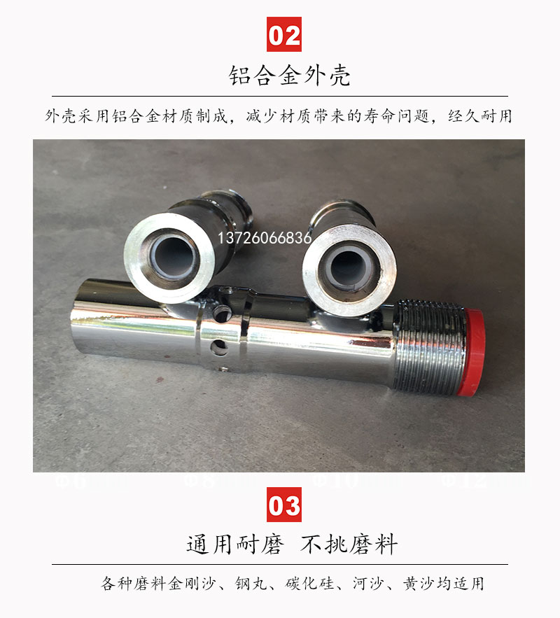 • 特点:双进风即二次进风,前后两个喷嘴,二者之间有间隔,在间隔处理的四周有八个小孔,在这种一大一小,一前一后的喷嘴布置形式中由于高速气流的作用,产生一个足够大的负压,将周围的空气吸入到喷嘴内,使喷砂出的空气量大于进入喷嘴的压缩空气,磨料的出口速度又有提高,从面提高喷砂效率。